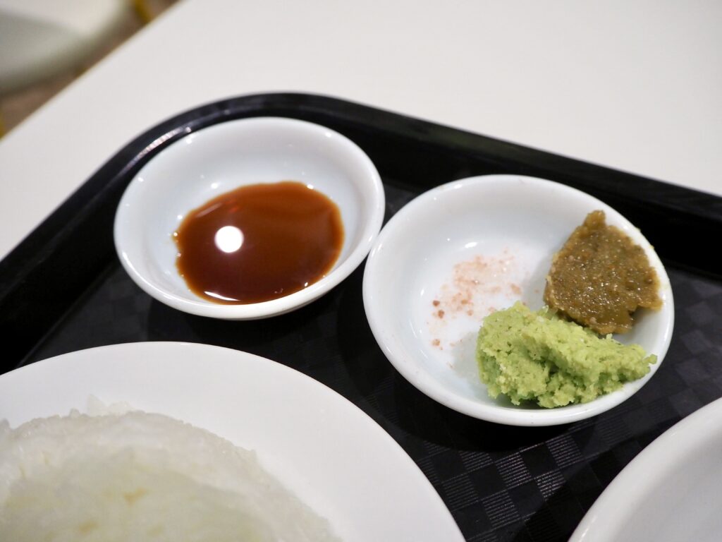 調味料はセルフで岩塩・わさび・牡蠣醤油・柚子胡椒などがあり、色々試してみた結果、わさびが一番さっぱり。少量の柚子胡椒もピリッと爽やかでおすすめです✨