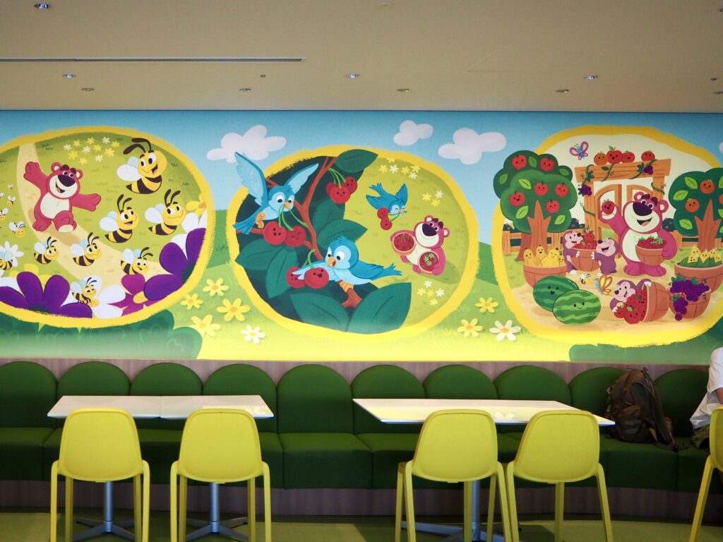 ロッツォの物語をモチーフにしたイラストが壁一面に描かれています。