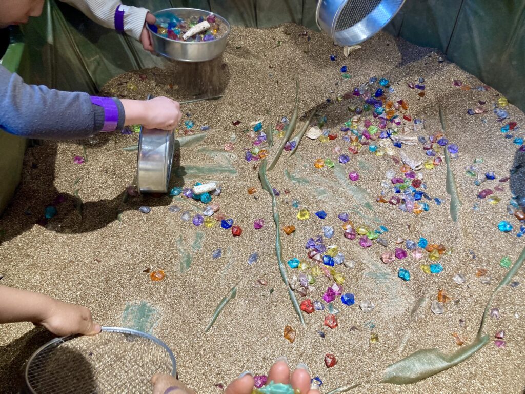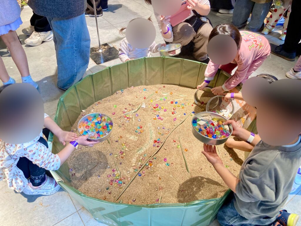 小さなプール状の容器の中からザルで砂をすくい上げて探す形式。